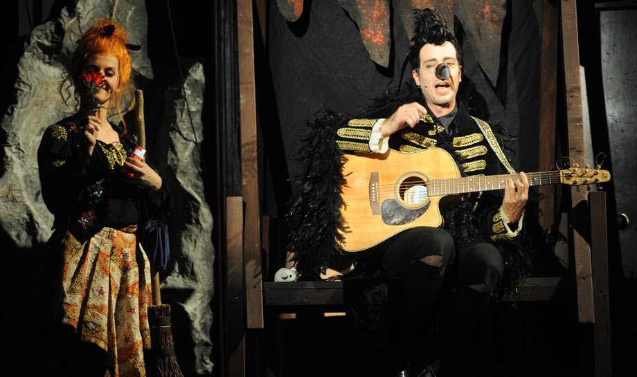 Auch Ausstatterin Jeannine Simon scheint eingeschworener Preußler-Fan zu sein. Sie hat ein Bühnenbild hingestellt, an dem man sich einfach nicht sattsehen kann. Muhme Rumpumpel samt Ober-, Knusper-, Kräuter- und Sumpfhexe hausen in einer Wohnwagen-Gemeinschaft, die aus lauter alten Kutschen besteht. Vorne links steht das Hexenhaus, rechts sitzt der Rabe auf seinem Stammplatz. Die Silhouetten der Bäume ragen auf der Rückseite in den Himmel. Hinter den Bäumen leuchtet wildromantisch der Mond.